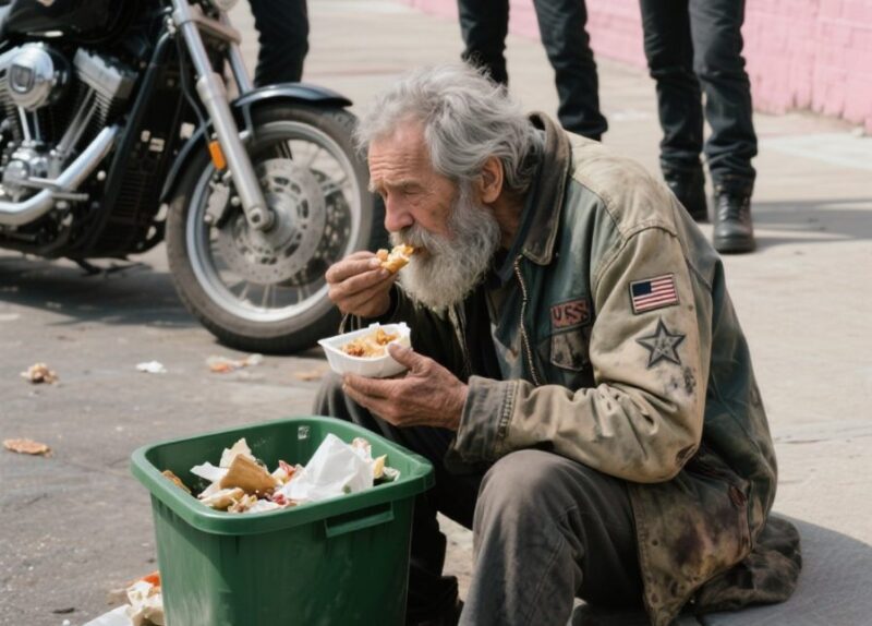 Der Mann, Arthur, durchsuchte die Abfälle behutsam und versuchte, seine Würde trotz des Hungers zu bewahren. Tank, 68 Jahre alt und Präsident des Motorradclubs, entschied sich einzuschreiten. „Lass uns mit ihm reden“, sagte er ruhig.