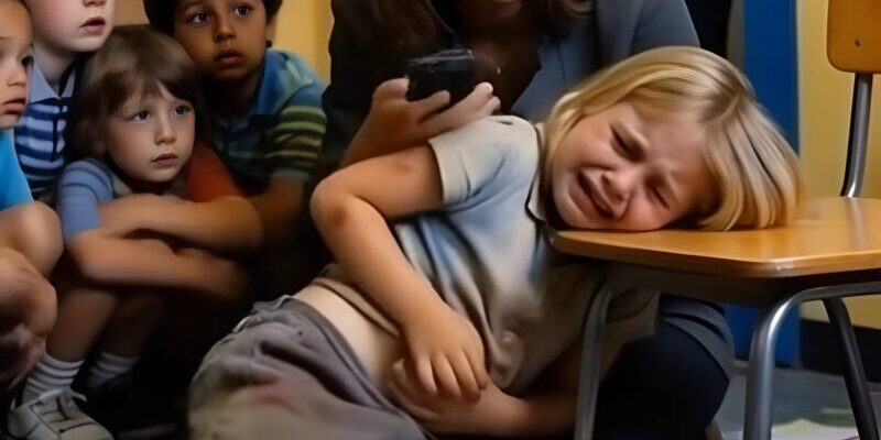 Sie hob den Blick und sah Emma, fünf Jahre alt, zusammengekauert unter ihrem Pult. Das kleine Mädchen presste mit zitternden Händen ihren Bauch, als versuche sie, einen starken Schmerz zurückzuhalten. Ihre blonden Haare waren zerzaust, und ihre zerknitterte, fleckige Kleidung ließ vermuten, dass sie nicht zu Hause geschlafen hatte. 😱